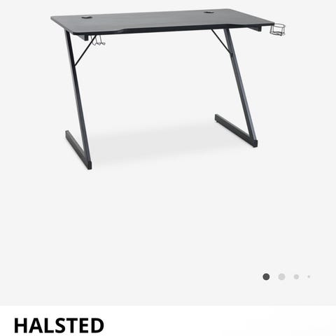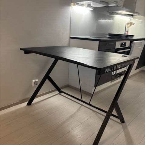 Musta ACT-gaming -pelipöytä kuuloketelineellä. Johtojen läpivientiaukot pöytälevyssä. Pientä käytön jälkeä on, mutta ei isompaa. Mukipidike tuli mukaan ostettaessa, mutta se oli niin epäkäytännöllinen, että irrotettiin.