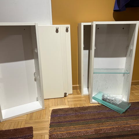 Metallinen kaappi missä lasinen ovi ja hyllyt. jossa peiliovet ja sisäiset hyllyt. Kaapin materiaali lasi, väri harmaa/metalli.