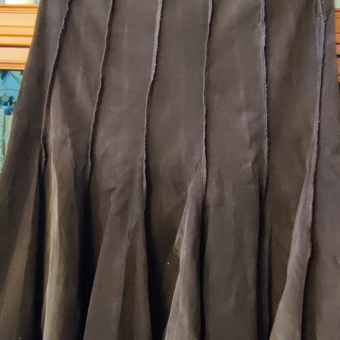 Musta sileäsamettinen hame, pituus 76 cm, taskut, vuori ja vetoketju. Hameeseen sopiva kultalangalla kudottu italialainen Jobis-merkkinen neulesetti 80 % viskoosia 9% polyesteriä ja 6% polyamidia. Koko 42.