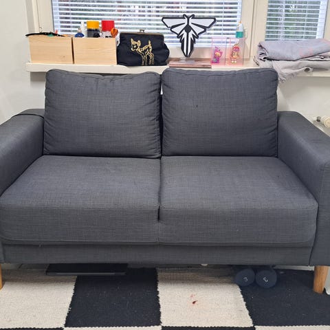 Myydään noin vuoden käytössä ollut kaunis harmaa sohva. Muutto tiedossa isompaan asuntoon, joten sohva liian pieni. Sohva on kahden istuttava, mutta kyllä siihen mahtuu kolmaskin halutessaan.