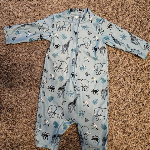 Paljon käytetty, mutta ehjä Kappahlin kaksiosainen uikkari. Paidan etuosassa tahra, joka ei ole lähtenyt pesussa, samaa tahraa myös housuissa. Näistä kuvat. Nyppyä myös paikoin.