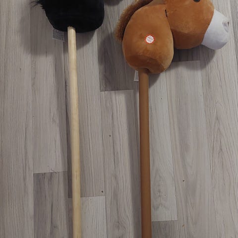 Hööksistä ostettu, enimmäkseen seissyt keppihevonen, keppiä lyhennetty