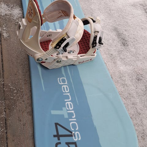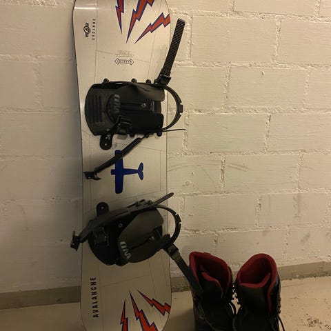 Kokeiluksi jäi meillä tämä harrastus, joten tästä todella vähän käytetty setti. Monojen sisämitta 28 cm. Lumilauta 150 cm pituus.