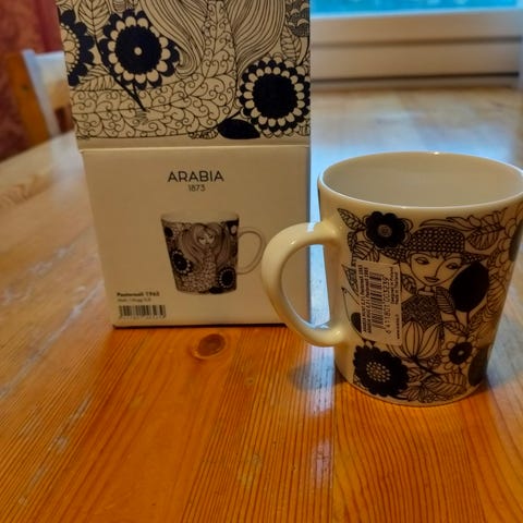 Arabia mukit, joissa on eriväriset ja erimuotoiset kuviot.