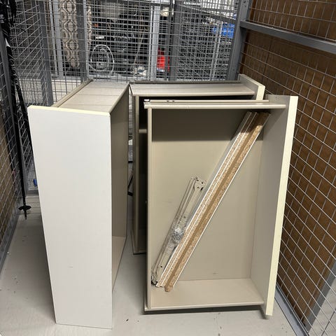 Useamman vuoden vanha. Ollut savuttomassa, eläimettömässä taloudessa vaatehuoneessa pitkäaikaissäilytyskäytössä. Yhteen laatikkoon ei kannata laittaa liian suurta painoa tai kannattaa tukea alalevy, koska saattaa muuten taipua pois urastaan. Pinnat suht siistit.