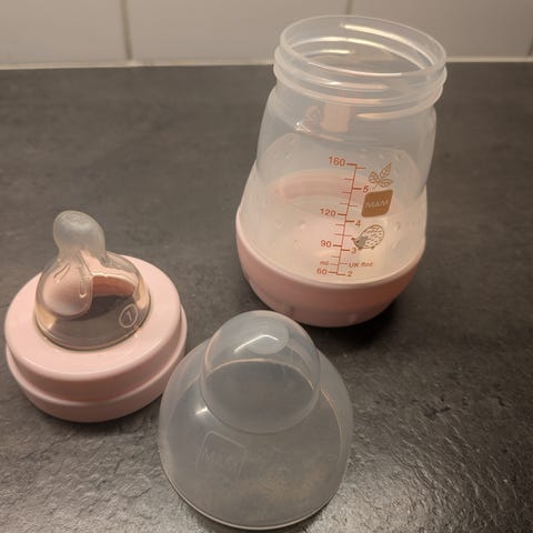 Ostin vauvalle, mutta hän ei ota sitä. Valkoinen ja sininen ovat uudet.Vaaleanpunaisia tuttipulloja on käytetty tuskin lainkaan kokeilemisen aikana, mutta tuttikappaleet on poistettu hygieniasyistä. Valkoiseen tuttipulloon tulee myös kaksi uutta "hitaasti virtaavaa" tuttiosaa. Nämä on avattu vain pakkauksesta, mutta niitä ei ole käytetty.