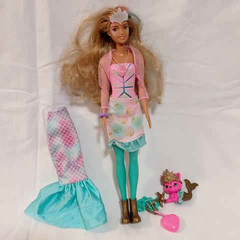 Barbie My Scene Masquerade Madness Chelsea Mermaid Diva hahmon lemmikki chihuahua merenneito koira. Hyväkuntoinen leikeissä ollut, paikoin pientä kulumaa/tummumaa/jälkeä maalipinnassa, pohjassa selvemmin.