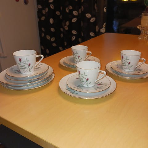 Kuppeja ja kermakko, sokerikko ja asetit. Kolmessa kupissa pientä vikaa, yleisesti siistit, lisää omaan kokoelmaasi.