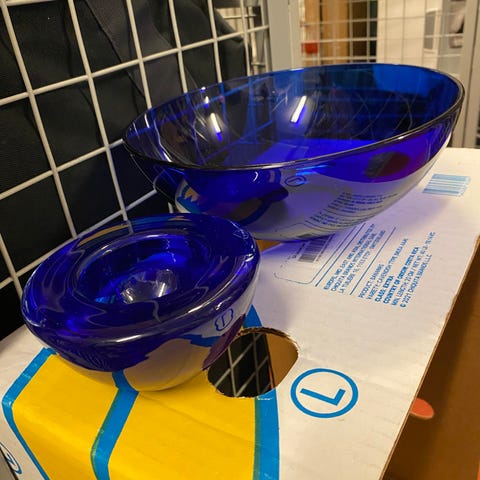 Pieni lasinen tarjoiluastia. Halkaisia 15 cm ja korkeus 7,5 cm.