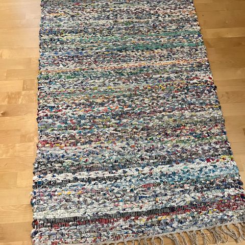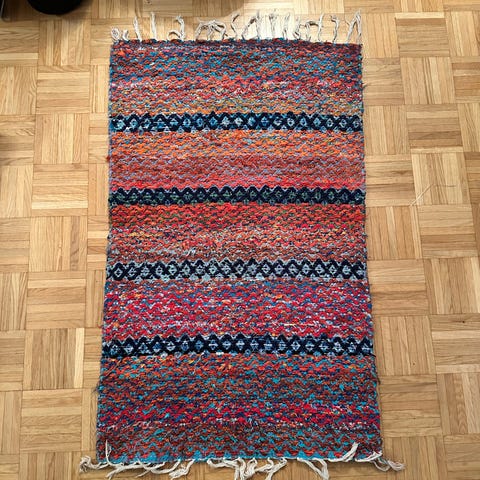 Myydään värikäs räsymatto. Leveys 75cm. Pituus 138 cm plus hapsut. Sävyinä vihreä, musta, keltainen, oranssin sävyt.