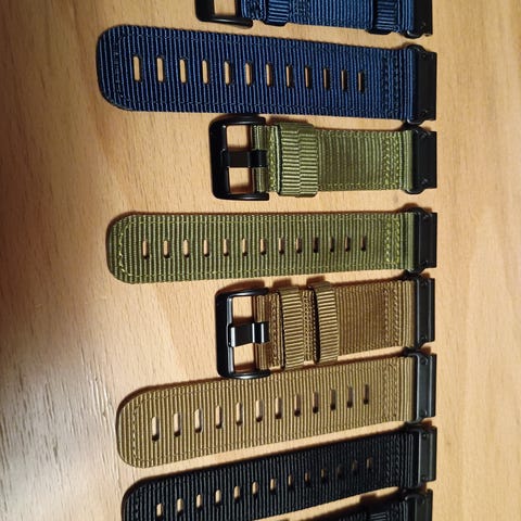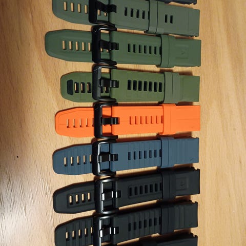 Muut rannekkeet Garminin quickfit mekanismilla paitsi punainen nailonranneke jossa ei mitään mekanismia ja Garminin keltainen ranneke joka on alunperin Forerunner 955 mallille. Tarvikerannekkeita ovat keltaista lukuun ottamatta.