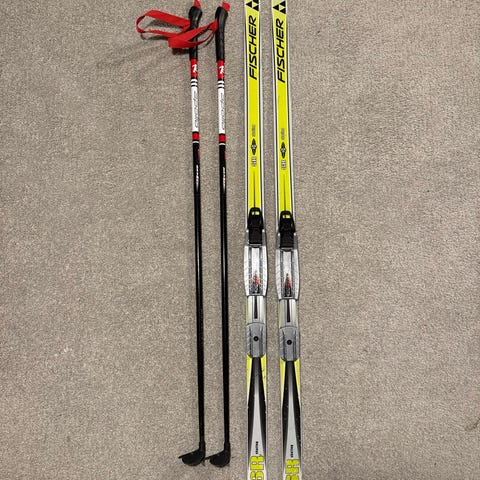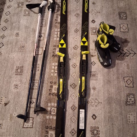 Fischer suksipaketti sisältää sukset, sauvat ja siteet. Sukset ovat 137cm ja sauvat 110cm. Sukset eivät tarvitse pitovoitelua. Pientä käytön mukana tuomaa naarmuuntumista pohjissa. Sauvat alumiinia.