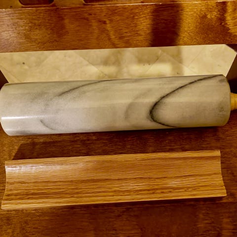 Marmorikaulin, jossa on musta kivirulla ja vaalea, irrallinen puukahva. Rulla on irrotettavissa kahvasta, mikä helpottaa puhdistusta ja säilytystä. Varren kanssa 50cm leveä.Kaulin on hyvässä kunnossa ilman näkyviä vaurioita tai kulumia.