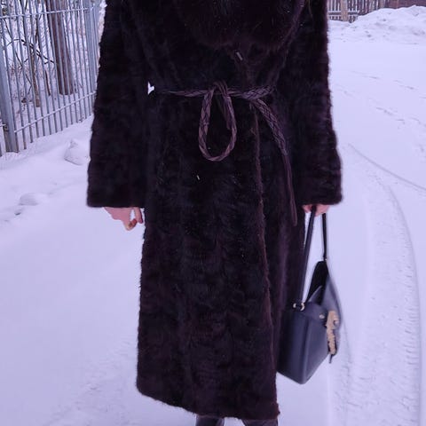 Very warm and elegant mouton fur coat with a natural mink fur hood.