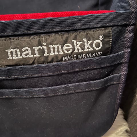 Marimekon klassikko, musta olkalaukku. Materiaalina nylon eli pitää hyvin kosteutta.
