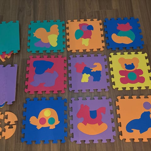Myydään 9 palasta koostuva vauvan palapelimatto / leikkialusta. Noin 90 x 90 cm yhteiskoko. Hyvssä kunnossa. Palojen toinen puoli "kuvioinen", toinen sileä.