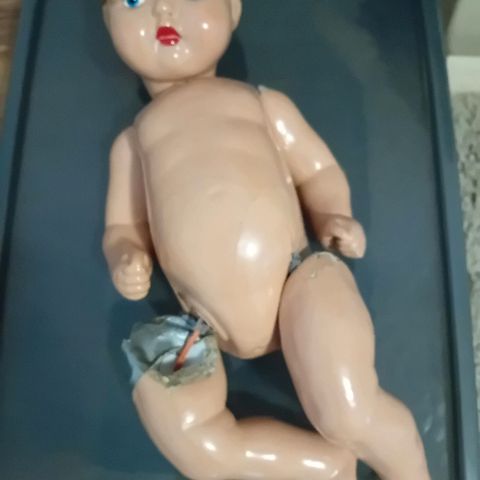 Pituus 50 cm, alkuperäiset vaatteet, raajat vaativat kiristystä, ummistaa silmät, on ehkä kuulunut jotain ääntäkin aikoinaan