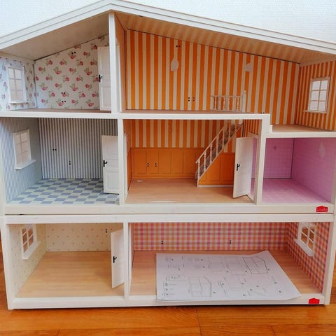 3- kerroksinen Lundby nukketalo erillisillä kesä- ja talvipihoilla ja kuvanmukaiset tavarat mukaan. Muutama nukke, mattoja ja lamppuja on myös paketissa mukana ja etsin vielä jos löytyy lisätarvikkeita ja huonekaluja lisää.