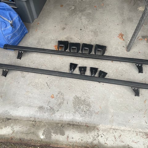 Muutaman kerran käytetyt lukittavat taakkatelineet, mitkä sopii autoihin joissa suljetut kattokaiteet. Käytetty Volvo XC 40:ssa.
