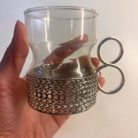Iittala lasinen kuppi kultaisella metallipidikkeellä