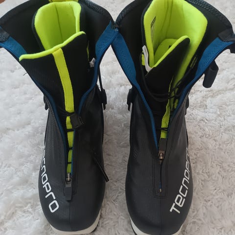 Tecno Pro hiihtomonot. Monot on varustettu vetoketjulla ja tarrakiinnityksellä nilkan kohdalla. Pohja on punainen ja musta. Soveltuvat luisteluhiihtoon. Vasemmassa monossa pieni tahra/musta viiru, mutta ei haittaa mitenkää käyttöä!