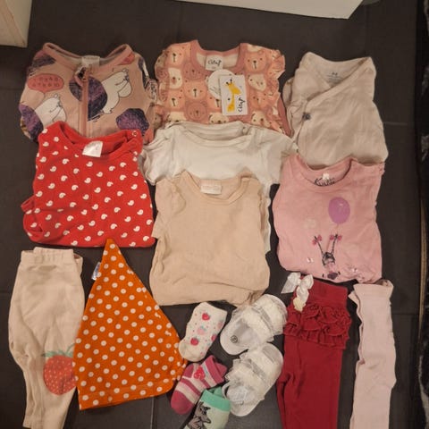 Sisältää sydänkuvioisen bodyn kätevin nepparein, puolipotkuhousut, collegehousut ja sukat. Sukat violetit liiloin sydämin, muut pinkkiä ja vaaleanpunaista. Kaikki vaatteet uusia ja niissä vielä laput kiinni. Vaatteet kokoa 62cm ja sukat 0-6kk.