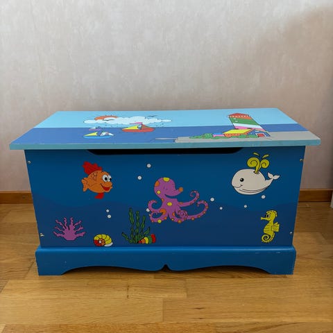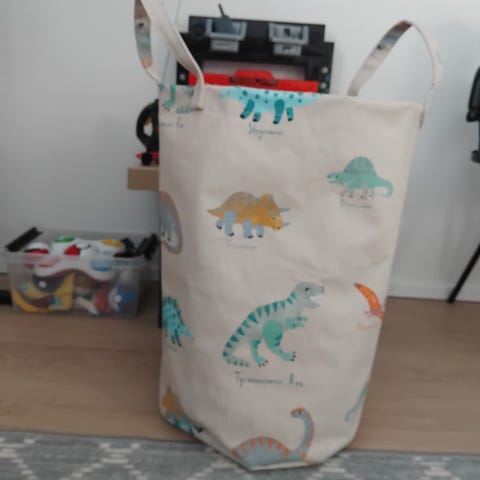 myydään siisti ja hyvä tekstiilinen lelukori, jonne lelut mahtuvat hyvin. Upeat köysi hihnat.