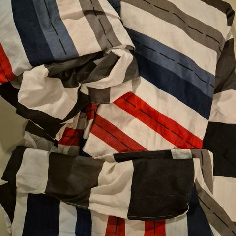 Finlaysonin pussilakana ja tyynyliina. Yleisilme hyvä, mutta muutamia langanvetoja ja vähän kellertymää valkeissa osissa.