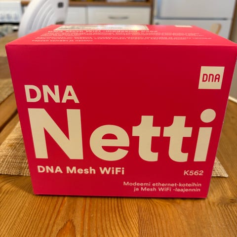 DNA Mesh WiFi - modeemi. Mukana virtalähde ja verkkokaapeli. Valkoinen väri, pyöreä muotoilu. Laite soveltuu kotikäyttöön langattoman verkon muodostamiseen.