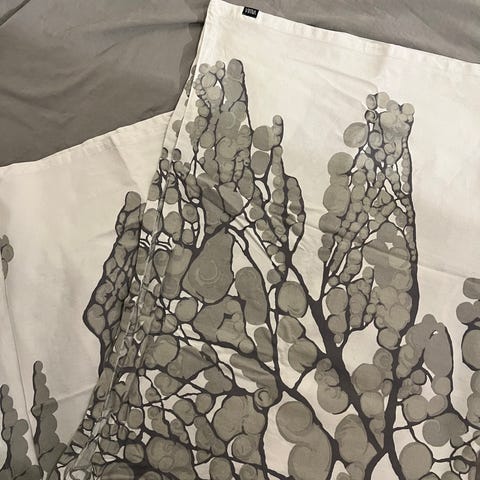 Myydään kaunis Vallilan Lumimarja-pöytäliina väreissä valko–harmaa.