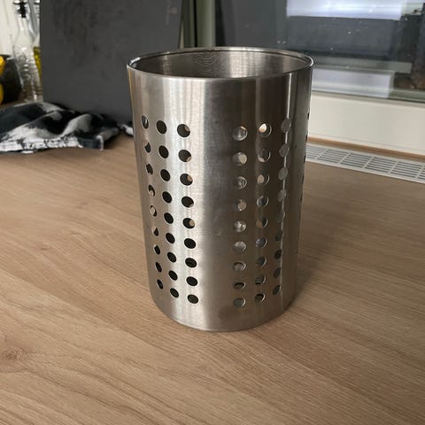 Jysk metallinen keittiötarvikeastia, jossa kahva ja rei'itetty rakenne. Sopii erilaisten keittiövälineiden säilytykseen ja kuljetukseen.