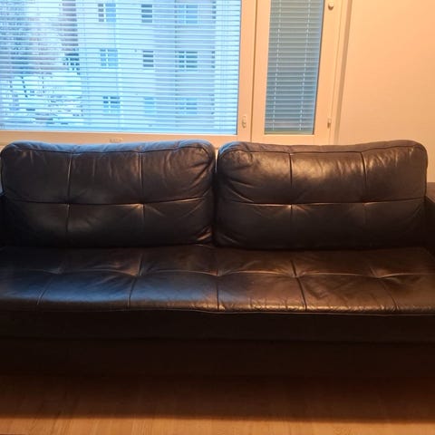 Musta kahden istuttava nahkasohva. Ostettu ainoinaan Iskusta. Sohvan takaosa tekonahkaa. Hyvässä kunnossa.