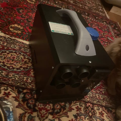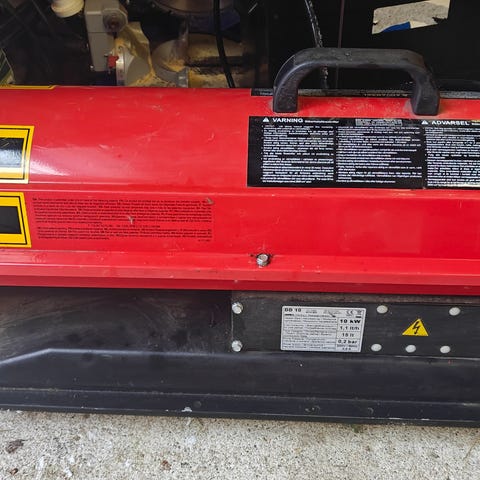 Tehokas lämmitin 28kw toimii, testattu,230v pistotulppa kiinni ja katkaisiasta käyntiin.Pyörät alla ja vetoaisa.
