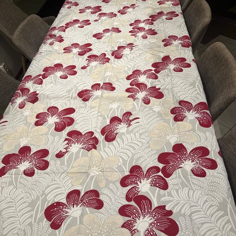 Myydään Finlaysonin puuvillainen Silmu-pöytäliina, beigellä pohjalla hillitty risukuosi. Ajaton liina, mutta jäänyt pieneksi uuteen pöytään.