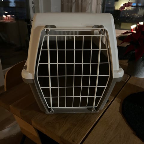 Matkakoppa lemmikille. Hyvässä kunnossa, vaikkakin pieniä käytön jälkiä on. Kopassa on kantokahva päällä.