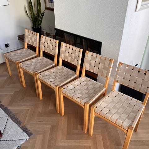 Kaksi Artekin 611 tuolia entisöitäväksi. Toisessa ei vöitä lainkaan ja toisessa lähes kaikki vyöt vaihtokunnossa.