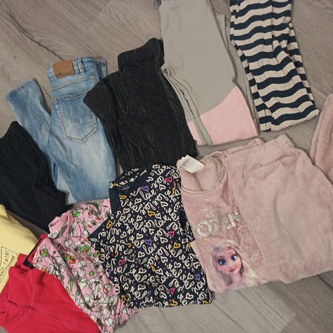 Kuvan vaatepaketti, koot välillä 128-140. Talvikengät kokoa 35. Huppareita, housuja, farkkuja, pyjama, mekkoja, shortseja, t-paitoja, toppahousut, uikkarit, neule yms. Osa vaatteista enemmän käytettyjä, osa kuin uusia. Kaikki kerralla noutaen. Omien menojen mukaan kulkeutuu Seinäjoelle, Kurikkaan tai Kauhajoelle.