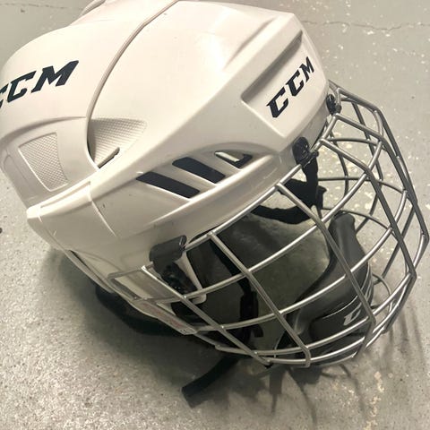CCM jääkiekkokypärä musta, varustettu metallisella kasvovisiirillä. Käytön jäljet näkyvät, mutta edelleen toimiva satunnaiseen luisteluun. Koko 51-55cm