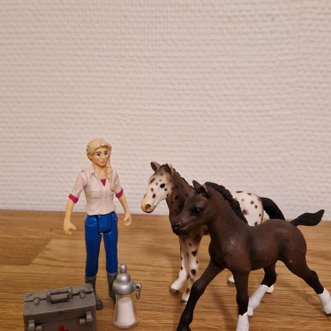 Setissä on kaksi varsaa, eläinlääkäri, riimu, eläinlääkäri pöytä, tietokone, aitoja 4kpl, eläinlääkäri laukku, ämpäri, pesusieni ja omena kori. Mitään ei voi ostaa erillisenä!