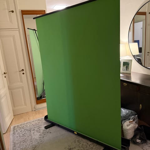 Vihreä kangas on helppo ottaa käyttöön. Avaa kotelon luukku, vedä kangas haluamallesi korkeudelle ja kangas asettuu itsestään paikoilleen. Kangas on yhtä helppo pakata kuin avatakin.