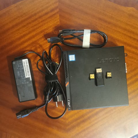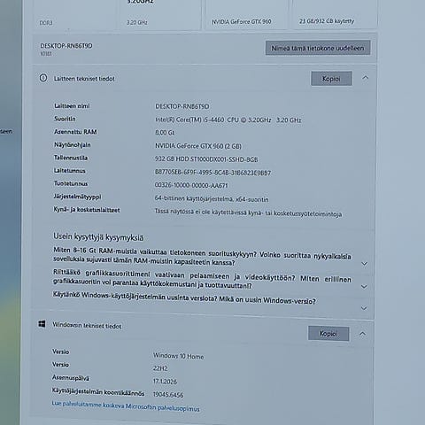 Lenovo pöytätietokone, jossa Intel Core i5 6400 -prosessori, 16 GB DDR4 RAM-muistia ja 256 GB Kingston SSD -levy. Toisena massamuistina 1 TB Seagate. Näytönohjaimena NVIDIA GeForce GTX 960 2GB.