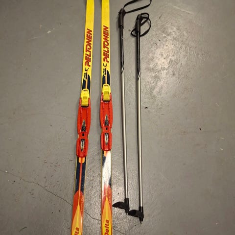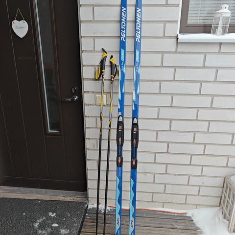 Sukset 170cm, sauvat 120cm ja monot 39. Käytetty ainoastaan koulun pakottamana liikuntatunneilla. Monot uudenveroiset.