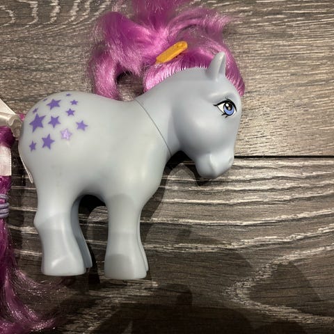 My Little Pony ponilelu, keltainen väri ja oranssit tähdet kyljessä. Muovinen materiaali, sopii lasten leikkeihin.