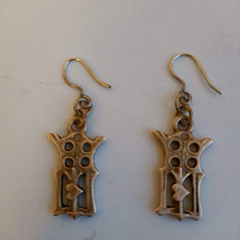 Myydään käyttämätön (saatu lahjaksi vuonna 1998) Kalevala Korun Neitsyt Marian monogrammi -korvakorut. Materiaali hopea, leveys 15mm, korkeus koukkuineen 45mm.