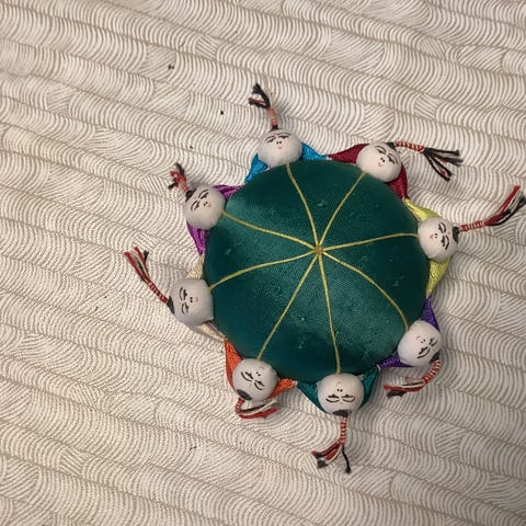 Pieni neulatyyny, aurinkovärjätty puuvillakangas, koko n. 6,5x6,5 cm