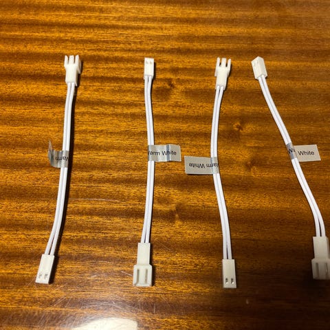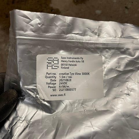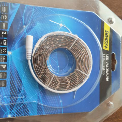 3m LED-valonauhat molemminpuolisilla liittimillä, eli molemmissa päissä on liitin muuntajalle. LED-nauhaa voi myös lyhentää leikkaamalla. Mukana on myös johtojen jatkopaloja. Yksi paketti (LED-nauha + muuntaja) 15 €. Koko paketti kaikkine kuvassa näkyvine tavaroineen 100 €.