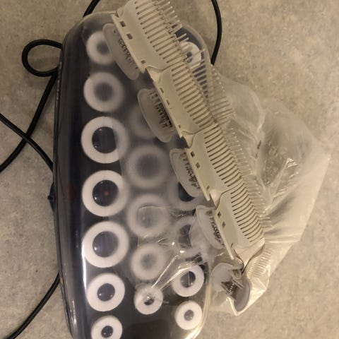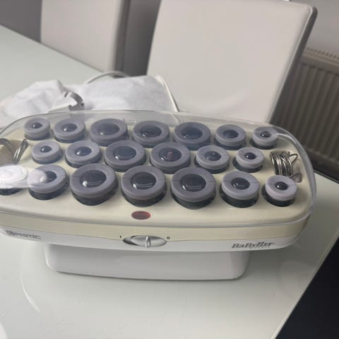 BaByliss lämpörullat musta väri. Mukana useita eri kokoisia rullia ja niihin kiinnitettävät pidikkeet. Suuria rullia 8 kpl läpimitta n. 3,5 cm, keskikokoisia 6 kpl läpimitta n. 2,8 cm ja pieniä 6 kpl läpimitta n. 2 cm. Laitteessa on suojakansi ja säädettävä lämpötila. Suojakannessa naarmuja ja pieni halkeama, joka ei ole läpi. Toimivat. Siistit rullat. Käytetty vain muutaman kerran.