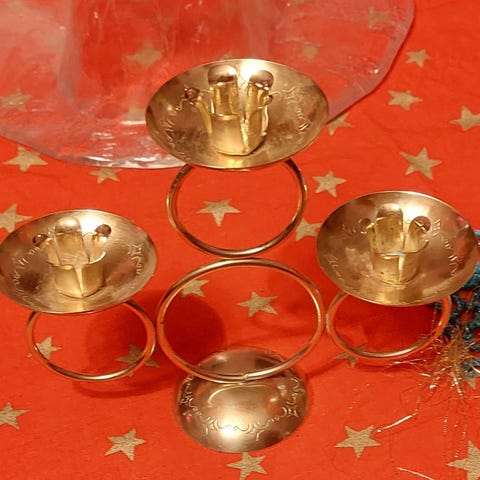 Vintage messinkinen 3-haarainen kynttilänjalka. Korkeus 23 cm, leveys 22,5 cm.