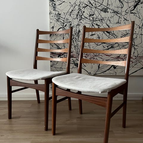 Kauniit tiikkituolit. Erinomaisessa kunnossa ikäisekseen, verhoilu uusittu mustalla keinonahalla.