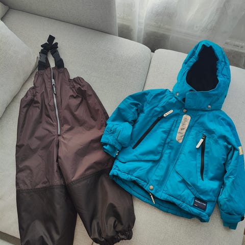 Takki ollut vähäisellä käytöllä ja tosi siisti. Housuja enemmän käytetty. Lahkeissa sisäpuolella parit reiät, ei näy ulkopuolelle. Henkselit mukaan. Molemmat nimikoituja.